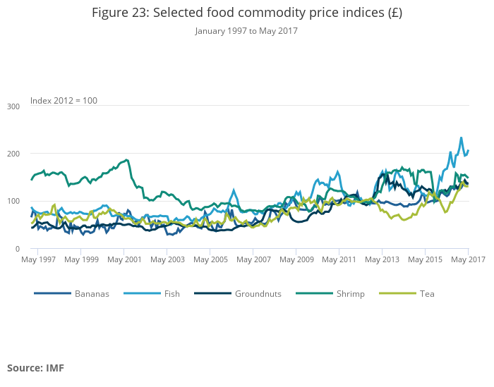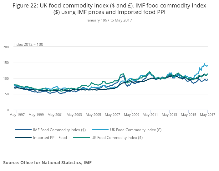 - The sterling exchange rate depreciation during 2016 has been a strong influence on differences between the UK-weighted index for commodity prices compared with world commodity prices, which are also reflected, to differing degrees, in the prices producers pay for imported food and metal commodities.