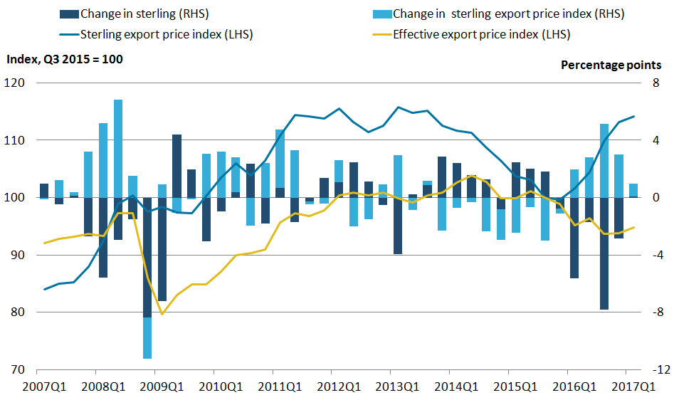- The effective export price (UK export price adjusted for exchange rate movements) has been on a declining trend and has fallen 5.2% since Quarter 3 (July to Sept) 2015.