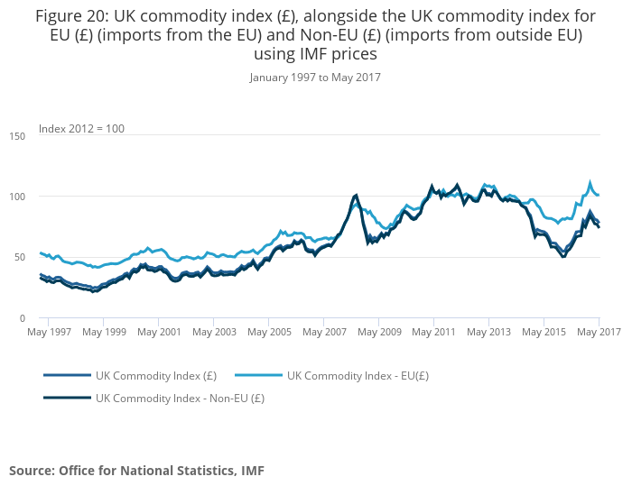 - The sterling exchange rate depreciation during 2016 has been a strong influence on differences between the UK-weighted index for commodity prices compared with world commodity prices, which are also reflected, to differing degrees, in the prices producers pay for imported food and metal commodities.