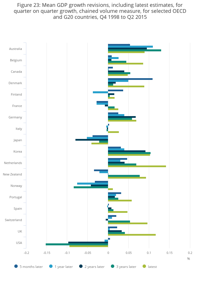 Figure 25: Mean GDP growth revisions, including latest estimates but removing the impact of the switch to CPI for the UK, for quarter on quarter growth, chained volume measure, for selected OECD and G20 countries, Q4 1998 to Q2 2015