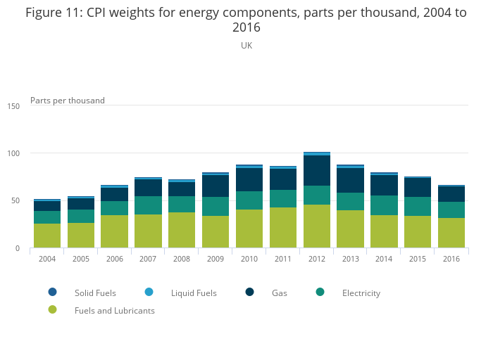 Image .csv .xlsThe rate of inflation for these energy components, combined with changes in their weight in the CPI, account for a large portion of recent movements in the CPI. The weights in the inflation basket are reviewed and revised each January to reflect updated information on the patterns of consumer expenditure. Items which account for a larger (smaller) proportion of total household spending are given a greater (lesser) weight in the index. Between 2004 and 2012, the total weight of energy in the CPI basket almost doubled, from 52 parts per 1,000 to 102, reflecting the increasing proportion of total consumer spending on energy (Figure 11). Of this near doubling in the energy weight, the greatest proportion was due to fuels and lubricants, which increased from 26 to 46 parts per thousand, and gas, which increased from 11 to 32 parts per thousand. As energy price inflation has moderated, its weight has also started to come down. Since 2012, the total weight of energy fell steadily from 102 to 62, out of 1,000, and this was again driven by a reduced weight associated with gas – 32 to 16 – and fuels and lubricants for which the weight reduced from 46 to 32. After increasing from 13 to 20 between 2004 and 2009, the weight of electricity has been less variable than for gas and fuels and lubricants, varying between 19 and 21 until 2015 and now standing at 17 in 2016. .