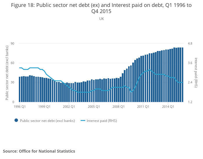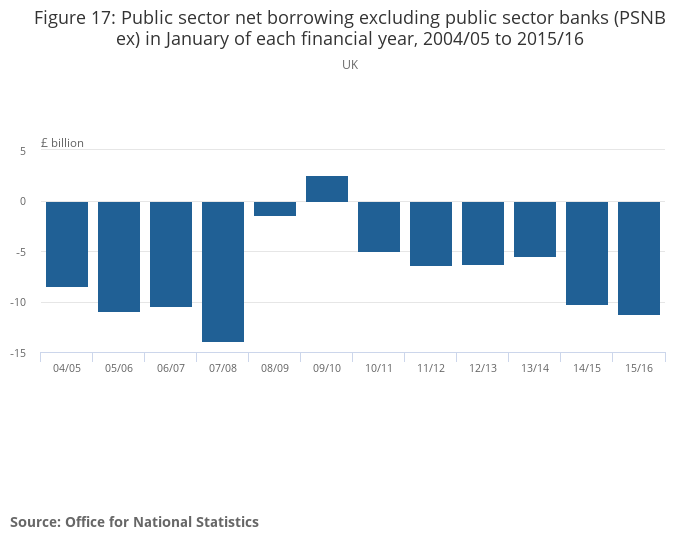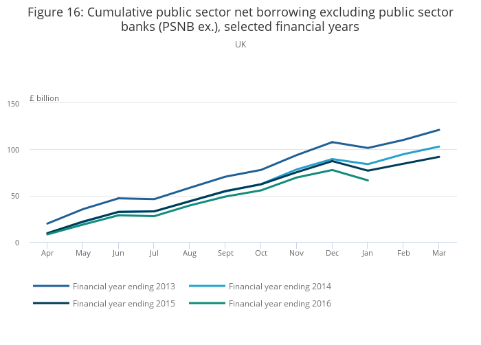 The continuation of the economic recovery and strength of employment growth have both contributed to reductions in Public Sector Net Borrowing. Figure 16 shows the performance of cumulative Public Sector Net Borrowing excluding public sector banks (PSNB ex) for the latest financial year-to-date (April 2015 to January 2016), and the previous 3 financial years. It shows that there was a marked reduction of around £18 billion between 2012/2013 and 2013/2014. However, the reduction between 2013/14 and 2014/15 (£11.1 billion) was smaller, particularly in the first half of that financial year. The reduction in the latest financial year to date (April 2015 to January 2016), accumulates to a fall in borrowing of £10.6 billion, to £66.5 billion, in the first 10 months of the financial year.