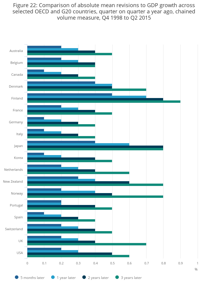 The UK is in the group of countries with the lowest mean revisions to quarterly GDP growth rates, of less than +/-0.05 percentage points, for periods up to 3 years after first publication. The UK also performs strongly on the basis of mean absolute revisions for the same periods.