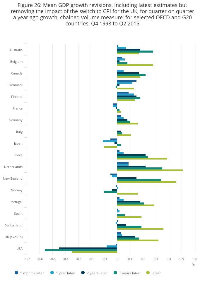 Figure 26: Mean GDP growth revisions, including latest estimates but removing the impact of the switch to CPI for the UK, for quarter on quarter a year ago growth, chained volume measure, for selected OECD and G20 countries, Q4 1998 to Q2 2015