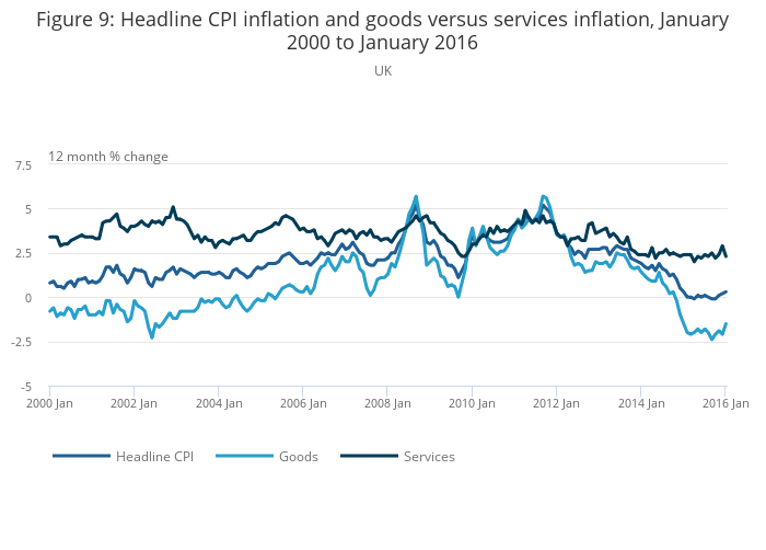 Figure 9: Headline CPI inflation and goods versus services inflation, January 2000 to January 2016