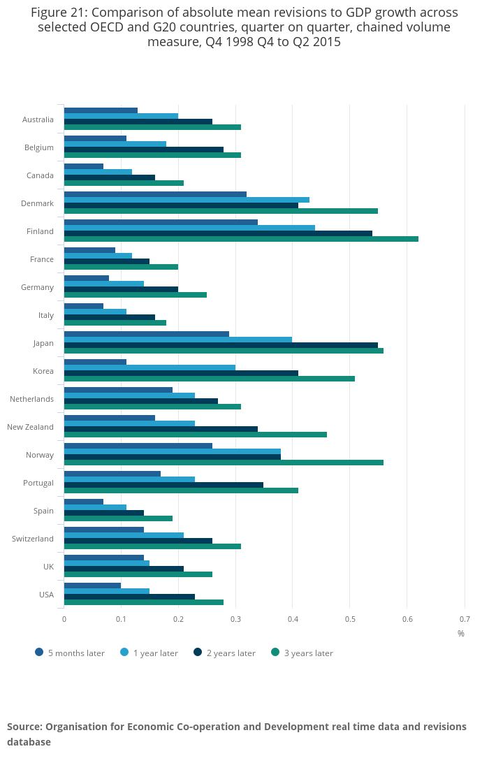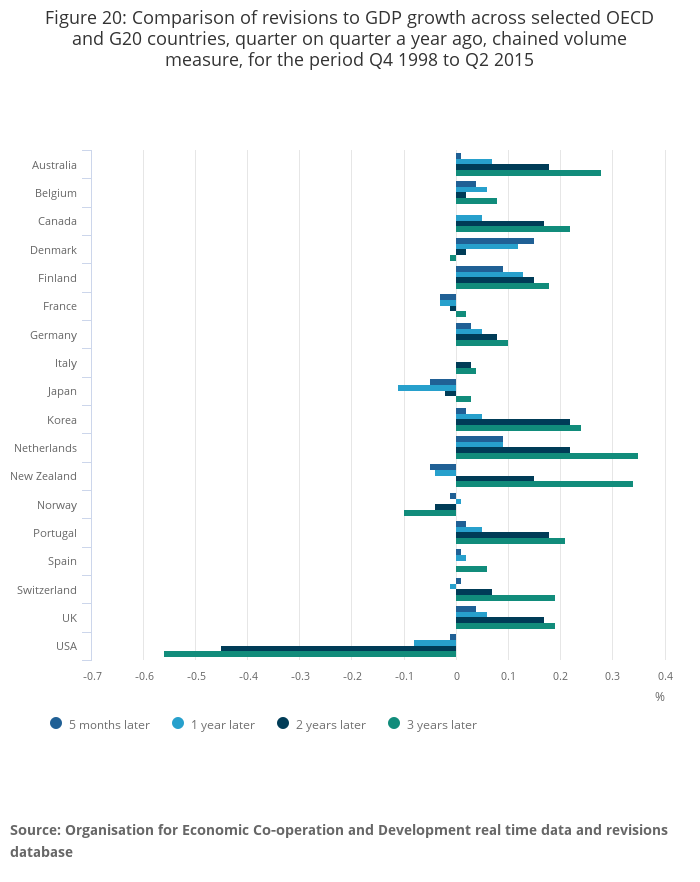 Extensive analysis of OECD data over a 17 year period shows that average revisions to UK GDP growth estimates for periods up to 3 years after initial publication are among the smallest across 18 OECD and G20 economies, and show no systematic bias.