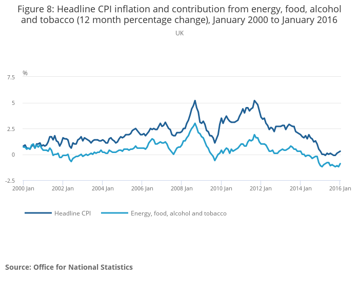 Figure 8: Headline CPI inflation and contribution from energy, food, alcohol and tobacco (12 month percentage change), January 2000 to January 2016
