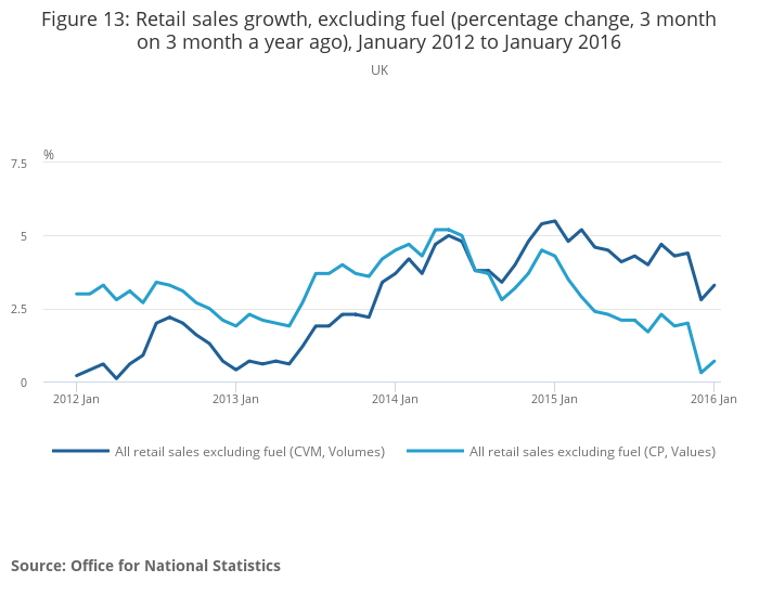Retail sales growth, in value terms, has been falling more quickly than growth in volume terms, indicating that while consumers have reduced the growth in their nominal expenditure, they are not experiencing the same slowing in growth in the volume of their purchases. Retail sales growth, excluding fuel, came down during 2015. However this edition finds that growth in the November 2015 to January 2016 period - covering the Christmas and January sales period - was much stronger than in Christmas periods between 2005 and 2012, but has eased compared with the previous year.