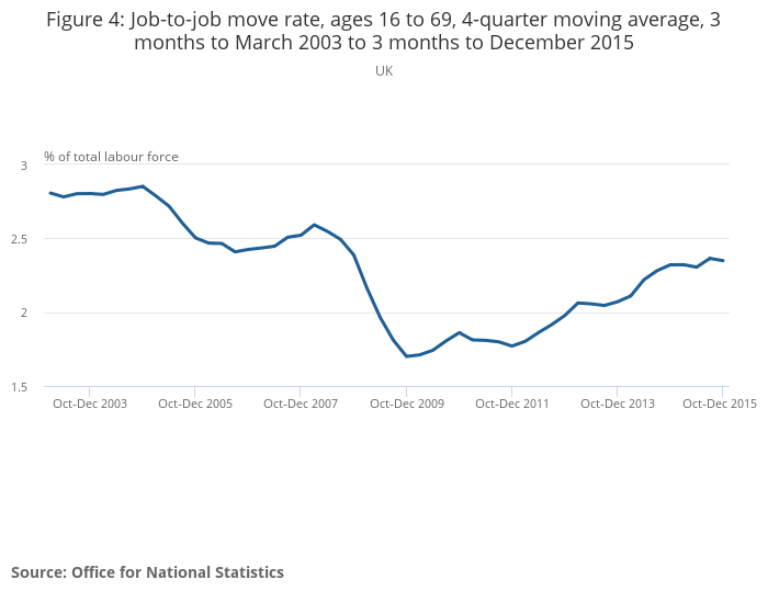 Figure 4: Job-to-job move rate, ages 16 to 69, 4-quarter moving average, 3 months to March 2003 to 3 months to December 2015