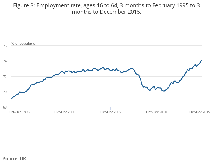 Figure 3: Employment rate, ages 16 to 64, 3 months to February 1995 to 3 months to December 2015,