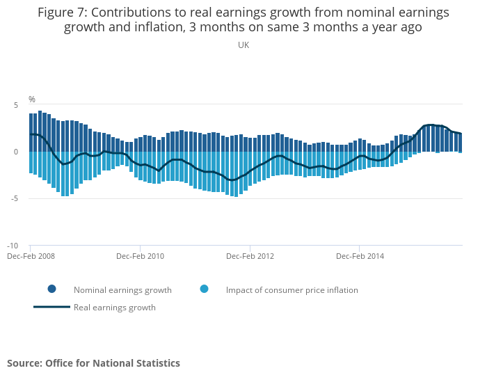 Figure 7: Contributions to real earnings growth from nominal earnings growth and inflation, 3 months on same 3 months a year ago
