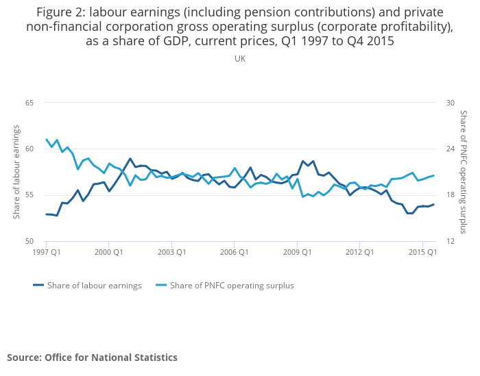 Figure 2: labour earnings (including pension contributions) and private non-financial corporation gross operating surplus (corporate profitability), as a share of GDP, current prices, Q1 1997 to Q4 2015