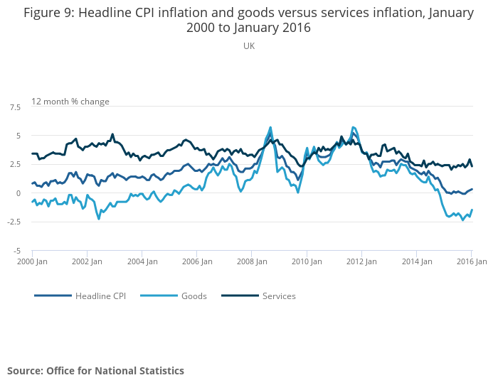 Download this chart Figure 9: Headline CPI inflation and goods versus services inflation, January 2000 to January 2016