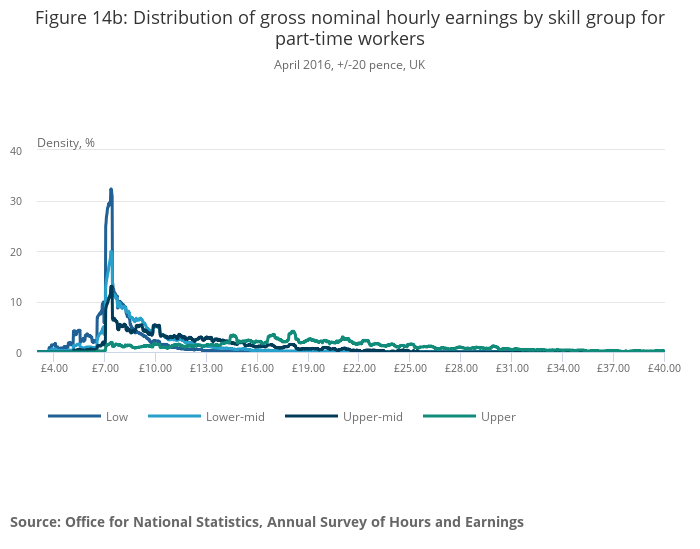 Around 10% of full-time 16- to 24-year-olds and 15% of part-time 16- to 24-year-olds appear to be getting paid at around the £7.20 NLW in April 2016, although they are not legally required to be paid this rate.