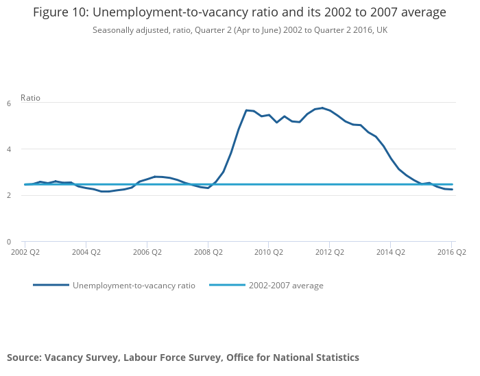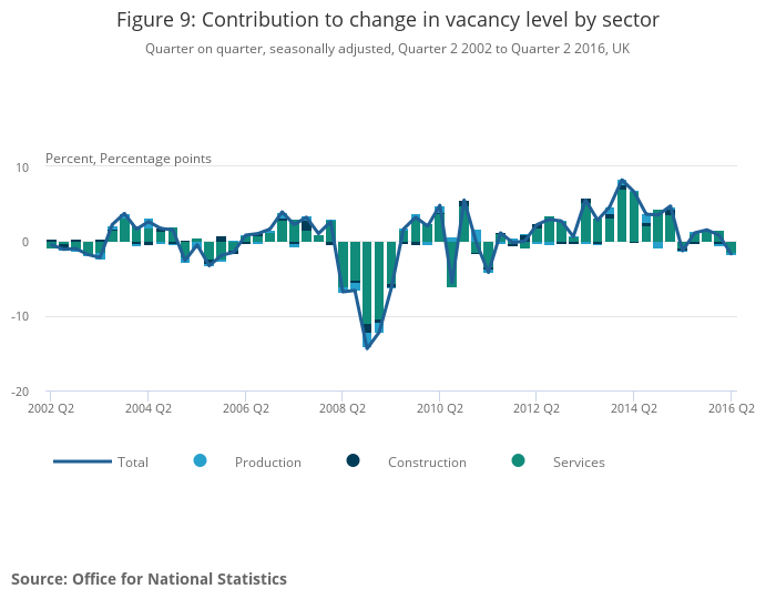 Vacancy estimates were recently published for the three months from May to July 2016, showing a 7000 fall on the previous non-overlapping quarter of February to April 2016. This continues a downward trend in the level of vacancies reported since early 2016.