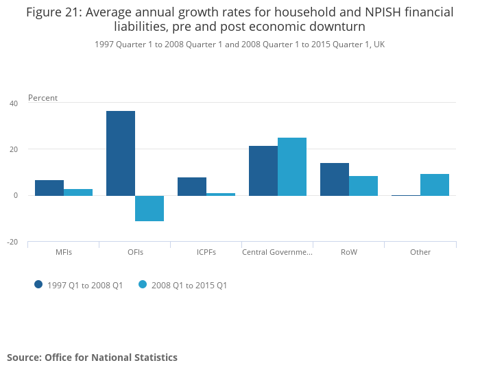 Figure 21 gives equivalent data for the average annual growth rate pre and post economic downturn for household and NPISH liabilities. These data show a large growth in the value of stocks of liabilities (mainly loans) held with OFIs before the economic downturn, which have since fallen back. Growth in liabilities with MFIs and the rest of the world sector has also slowed post-economic downturn.