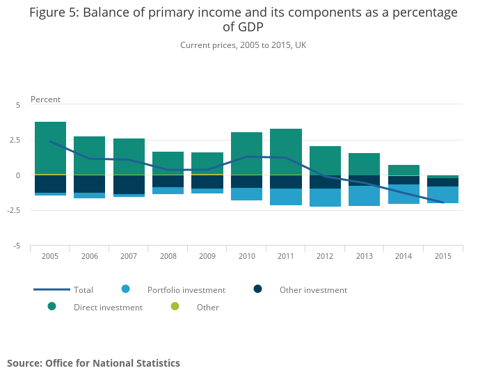 Net earnings on FDI fell from having a positive contribution of £13.3 billion in 2014 to negative £2.9 billion in 2015. This was the first time that net earnings on FDI have been negative on an annual basis since records began. On a quarterly basis, net earnings on FDI fell sharply in quarter 4 2015 to negative 1.3% of GDP, down from 0.3% of GDP in Quarter 3 (July to Sept). This fall in net earnings on FDI in Quarter 4 (Oct to Dec) 2015 has been the main contributor to the negative annual figure. Measured as a percentage of nominal GDP, the primary income account deficit in 2015 is also the highest on record at 2.0%.