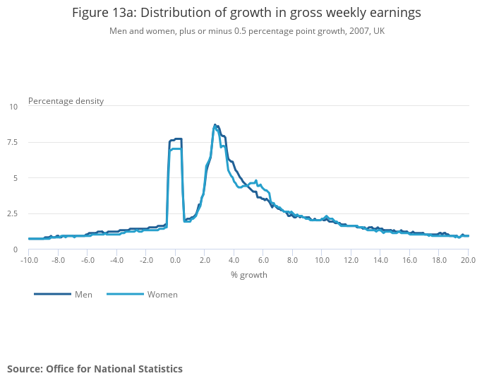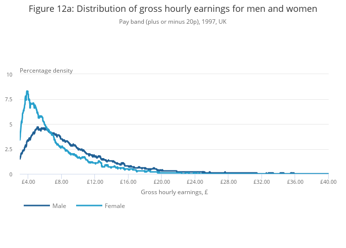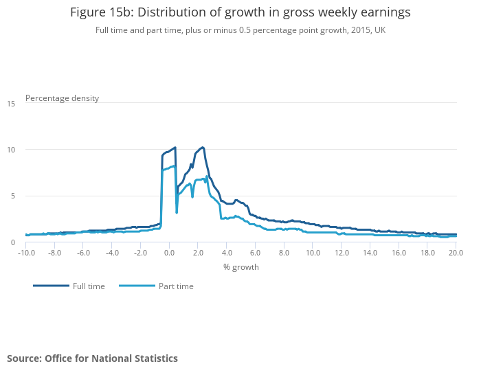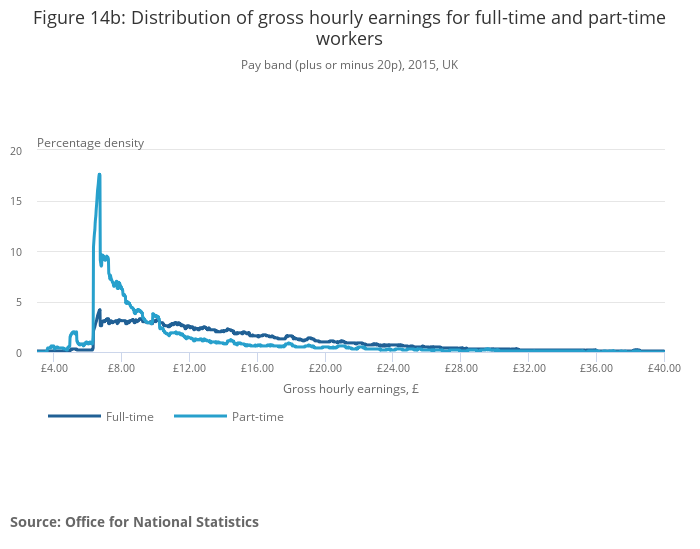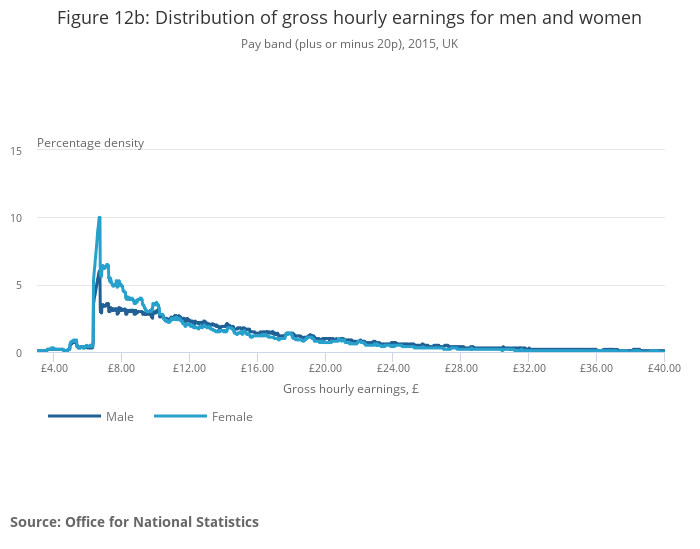 Analysis of hourly earnings distribution and growth in earnings for those in continuous employment, using Annual Survey Hours and Earnings (ASHE) 2015 data shows differences between men and women. Similar differences can be observed between those in part-time and full-time employment. For both genders, there is a greater concentration of hourly earnings around the National Minimum Wage (NMW) at the lower end of the income distribution compared to periods prior to the introduction of the NMW.