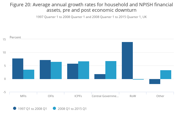 The only sector (aside from “other”) to significantly increase its growth rate in the value of assets after the economic downturn are those with a central government counterparty. This could be an indication of households holding more government debt as a form of security over more risky equity or other investments. Stocks of government debt held by households may also have increased in value after the economic downturn. However, central government only issued around 3% of overall household and NPISH assets in Quarter 4 2015.