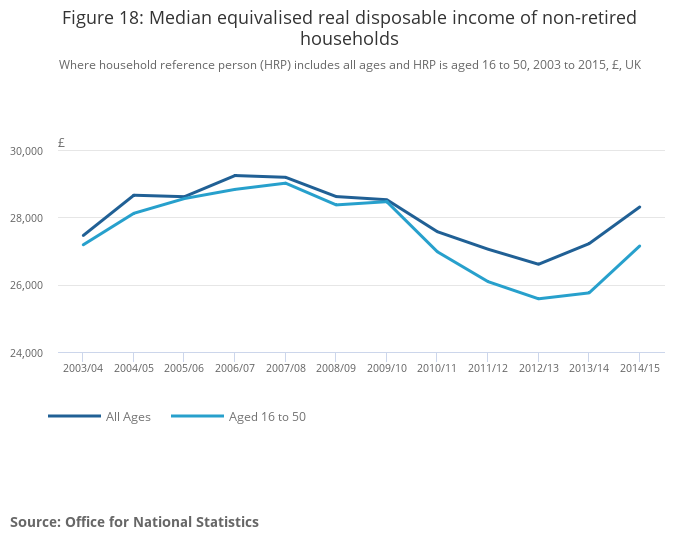 This is further evidence that the recovery of household income is partly due to improvements in the employment rates and income of older people relative to people in the lower age brackets. Furthermore, there is also likely to be some effect from the small number of retired people in non-retired households, as the introduction on the triple lock on the basic state pension would have also improved incomes of pensioners3.