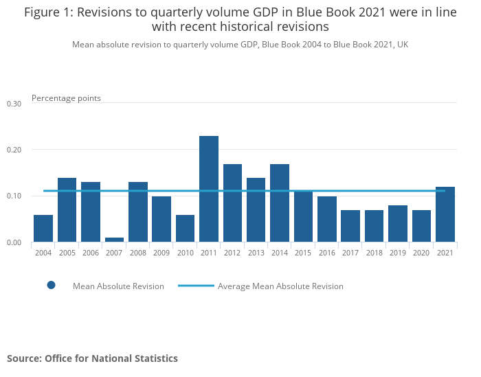 Revisions to estimates of gross domestic product (GDP) published in the annual Blue Book 2021 are in line with recent historical Blue Book revisions - there was a mean absolute revision (MAR) of 0.12 percentage points in Blue Book 2021.