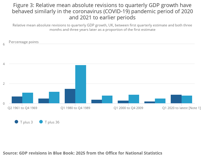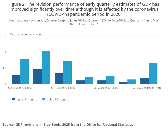 The mean absolute revision (MAR) to quarterly GDP from Quarter 1 (Jan to Mar) 2020 to Quarter 2 (Apr to June) 2025 in Blue Book 2025 was slightly larger than in recent Blue Books, at 0.66 percentage points, but this includes the whole coronavirus (COVID-19) pandemic period for the first time.