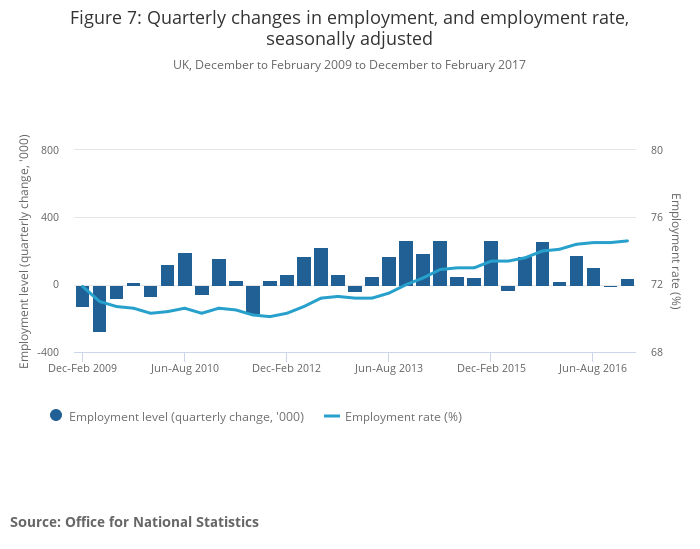 Headline labour market indicators show 39,000 more people in work in the 3 months to February 2017, driving the employment rate to 74.6%. As shown in Figure 7, the overall employment rate has been increasing since 2011.