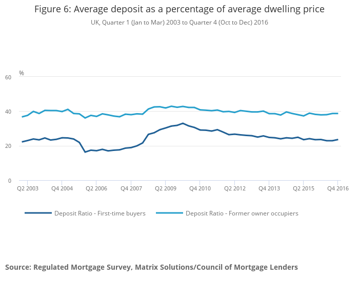 Since 2010, the deposit ratio for both first-time buyers and former owner-occupiers has been decreasing steadily. By Quarter 4 (Oct to Dec) 2016, the deposit ratio has returned to around the same level seen in mid-2008. In particular, first-time buyers have seen a decrease in the average deposit paid, from £61,000 in Quarter 1 2010 to £50,000 by the end of 2016.