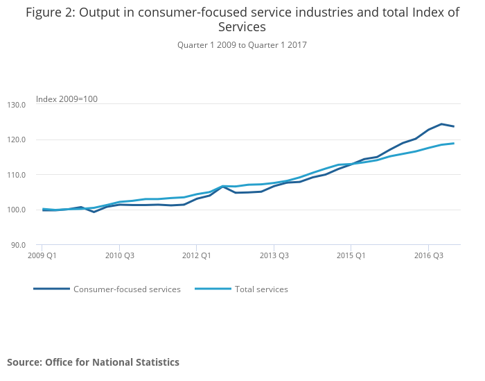 Figure 2 shows an index of output in consumer-focused service industries compared with the total index of services. Up until this quarter, growth in consumer-focused services had been consistently outpacing that of total services since early 2015. In 2016, consumer-focused services contributed 0.8 percentage points of the 2.5% annual output GVA growth (a disproportionately large contribution given their weight of around 12.6% of GDP).