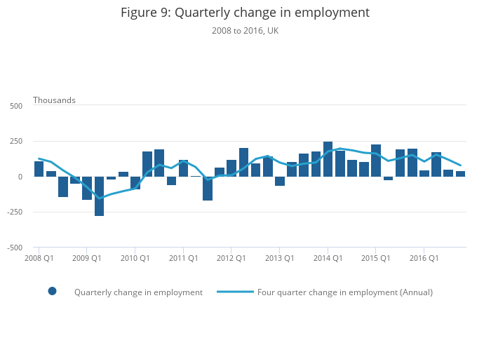 - UK economy continues to add jobs in the 3 months ending December 2016, but the increase is smaller than the recent past