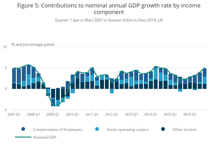 In contrast to the expenditure measure, which shows a slight slowing of firms’ investment, the income measure shows a return to stronger growth for firms’ income. In Quarter 4 (Oct to Dec) 2016, gross operating surplus (GOS) rose by 4.5% in the quarter and by 8.1% compared with Quarter 4 2015. This was the fastest growth rate on a quarter-on-same-quarter a year ago basis since Quarter 3 (July to Sept) 2014 and was 4.8 percentage points above the long run average (since 1997).