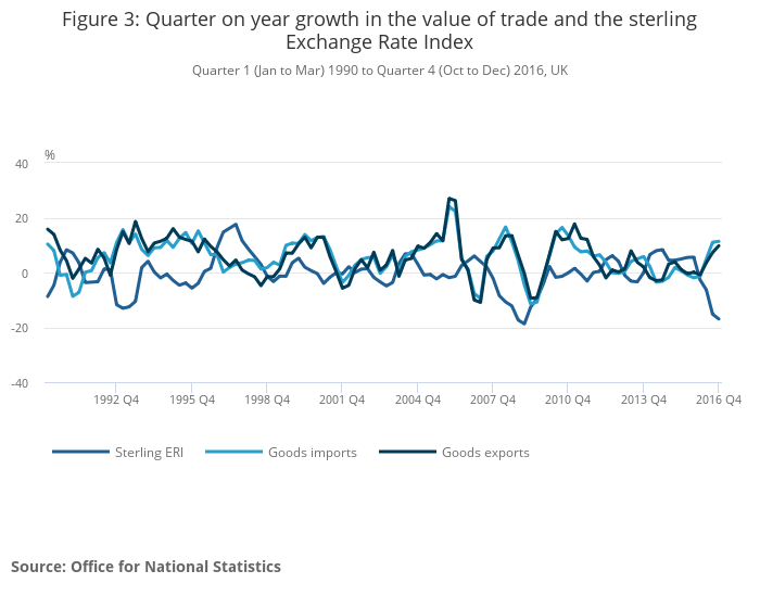 Figure 3 shows that there is little direct correlation between the value of imports, the value of exports and the exchange rate index. On a trade weighted basis, sterling depreciated 17.0% between the final quarters of 2015 and 2016, but despite this the latest data show little response, with the trade balance actually widening over the same period. However, this was a result of fairly large increases in the value of exports and imports (9.8% and 11.3% respectively).
