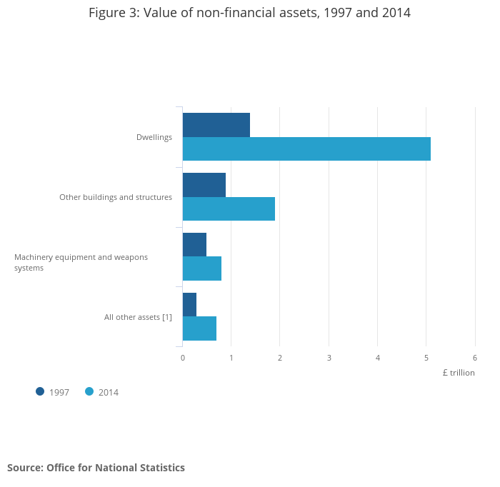 Dwellings remained the most valuable non-financial asset in the UK at £5.1 trillion, accounting for 63% of the UK’s total net worth at the end of 2014. Dwellings increased in value by £408 billion (9%) over the period 2013 to 2014