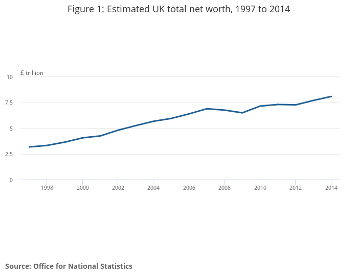 At the end of 2014, the total net worth of the UK was estimated at £8.1 trillion. This was equivalent to an average of £125,000 per person or £302,000 per household