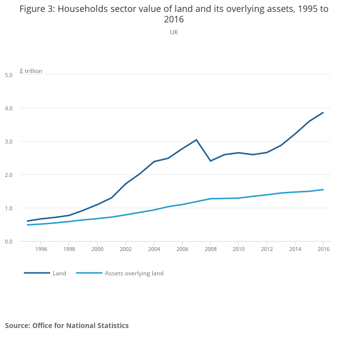 “Since 1995 the value of land has increased more than fivefold, making it our most valuable asset. At £5 trillion, it accounts for just over half of the total net worth of the UK at end-2016. At over £800 billion, the rise in the nation’s total net worth is the largest annual increase on record.”