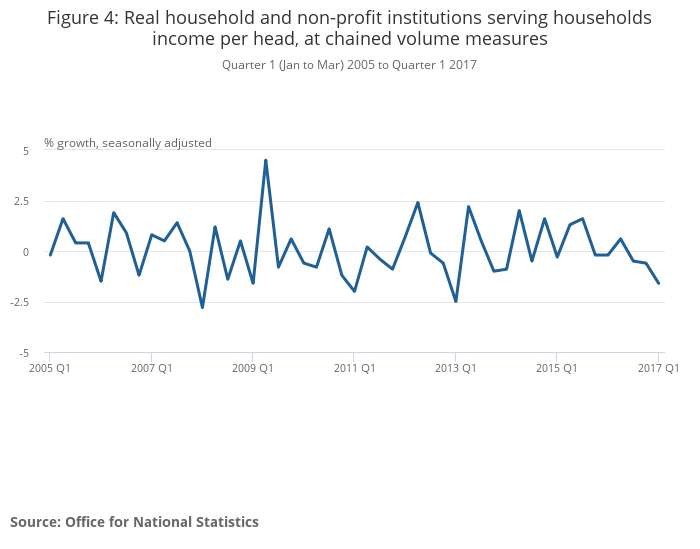 The level of real households and NPISH disposable income (RHDI) fell by 1.4% in Quarter 1 (Jan to Mar) 2017, following a decrease of 0.4% in the previous quarter. This represents 3 successive quarters of falling RHDI.