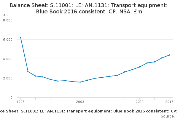 Download this time seriesBalance Sheet: S.11001: LE: AN.1131: Transport equipment: Blue Book 2016 consistent: CP: NSA: £m