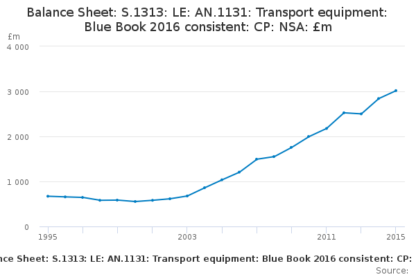 Download this time seriesBalance Sheet: S.1313: LE: AN.1131: Transport equipment: Blue Book 2016 consistent: CP: NSA: £m
