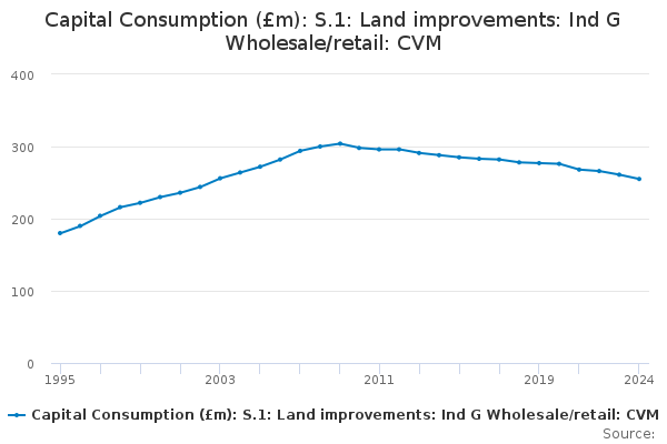 Download this time seriesCapital Consumption (£m): S.1: Land improvements: Ind G Wholesale/retail: CVM