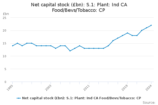 Download this time seriesNet capital stock (£bn): S.1: Plant: Ind CA Food/Bevs/Tobacco: CP