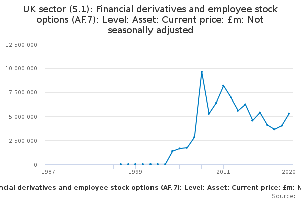 Download this time seriesUK sector (S.1): Financial derivatives and employee stock options (AF.7): Level: Asset: Current price: £m: Not seasonally adjusted
