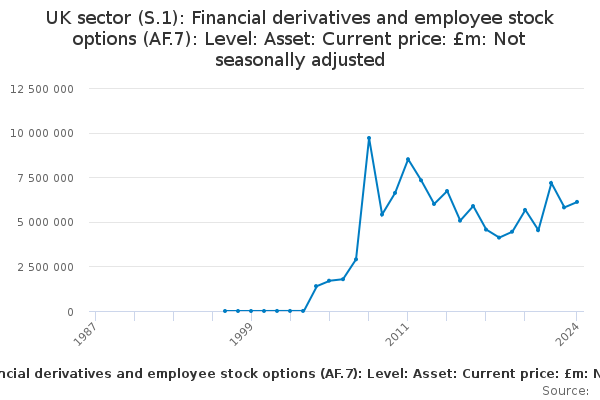 Download this time seriesUK sector (S.1): Financial derivatives and employee stock options (AF.7): Level: Asset: Current price: £m: Not seasonally adjusted