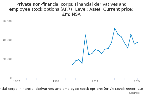 Download this time seriesPrivate non-financial corps: Financial derivatives and employee stock options (AF.7): Level: Asset: Current price: £m: NSA