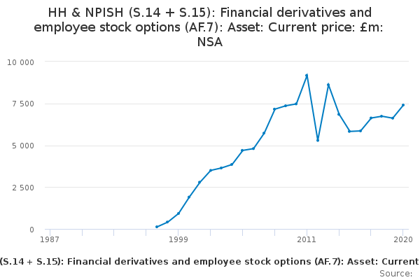 Download this time seriesHH & NPISH (S.14 + S.15): Financial derivatives and employee stock options (AF.7): Asset: Current price: £m: NSA