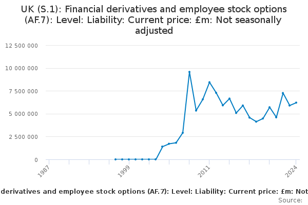 Download this time seriesUK (S.1): Financial derivatives and employee stock options (AF.7): Level: Liability: Current price: £m: Not seasonally adjusted
