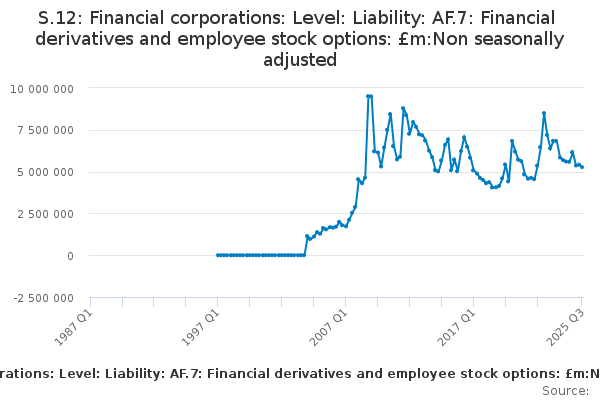 Download this time seriesS.12: Financial corporations: Level: Liability: AF.7: Financial derivatives and employee stock options: £m:Non seasonally adjusted