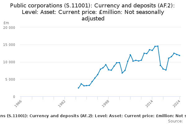 Download this time seriesPublic corporations (S.11001): Currency and deposits (AF.2): Level: Asset: Current price: £million: Not seasonally adjusted