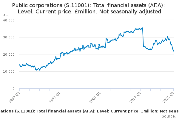 Download this time seriesPublic corporations (S.11001): Total financial assets (AF.A): Level: Current price: £million: Not seasonally adjusted