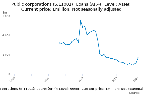 Download this time seriesPublic corporations (S.11001): Loans (AF.4): Level: Asset: Current price: £million: Not seasonally adjusted