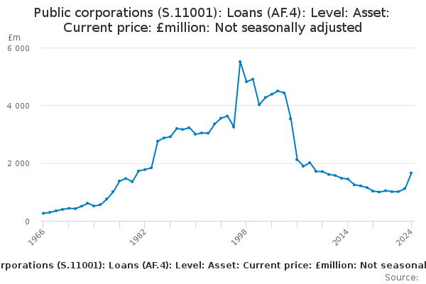 Download this time seriesPublic corporations (S.11001): Loans (AF.4): Level: Asset: Current price: £million: Not seasonally adjusted